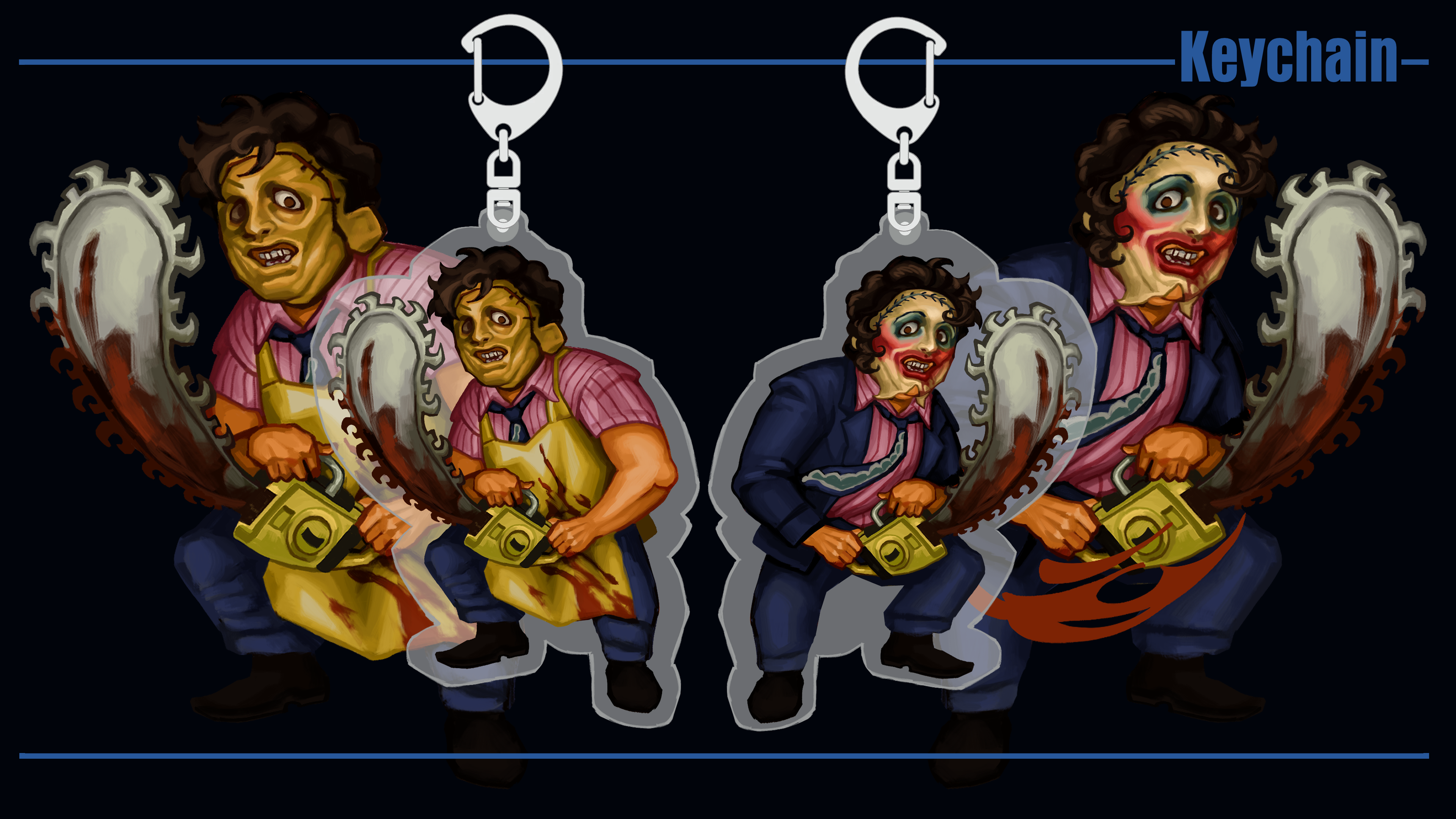 A double-sided acrylic keychain of Leatherface in his Original and Pretty Woman masks.