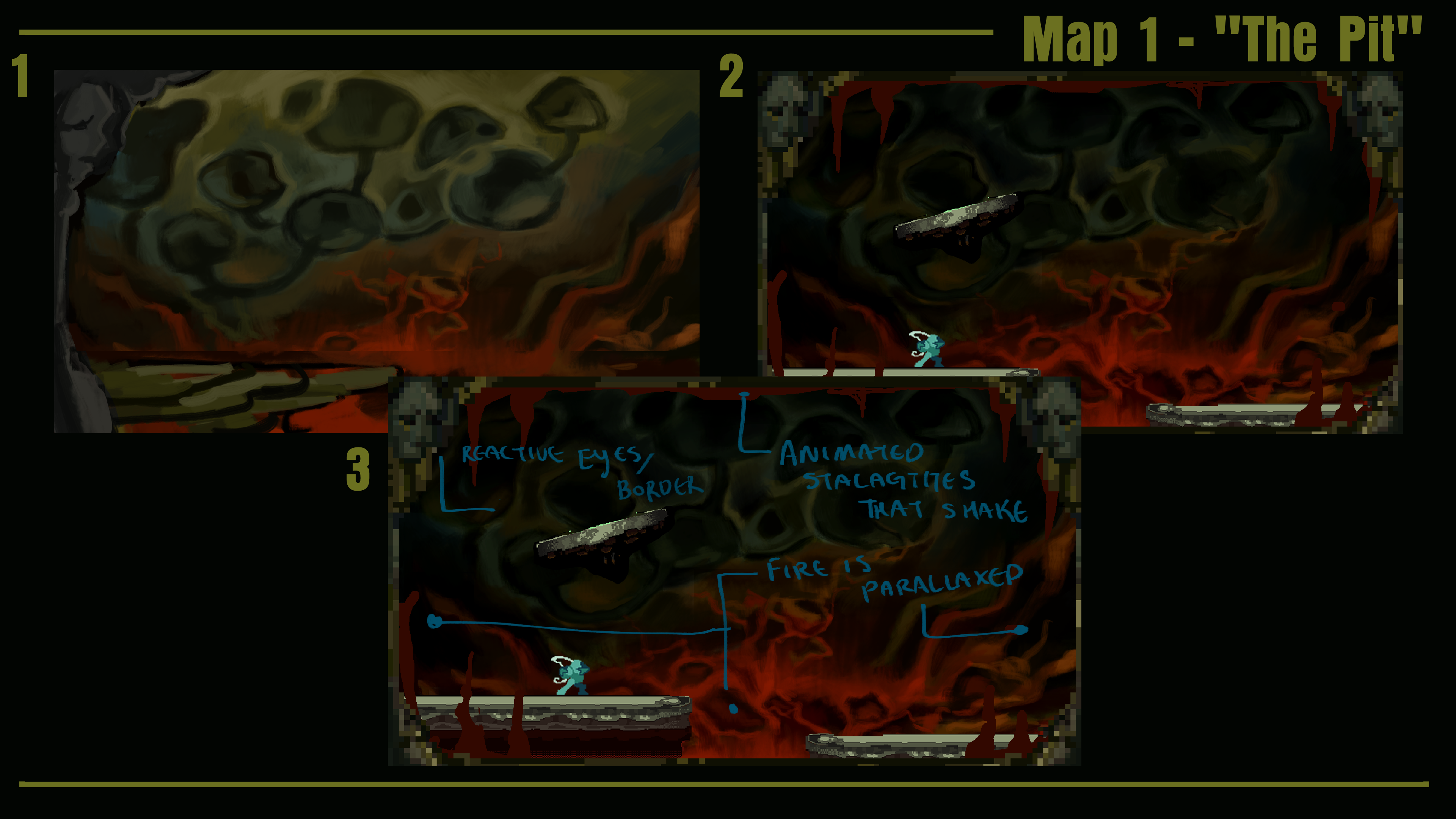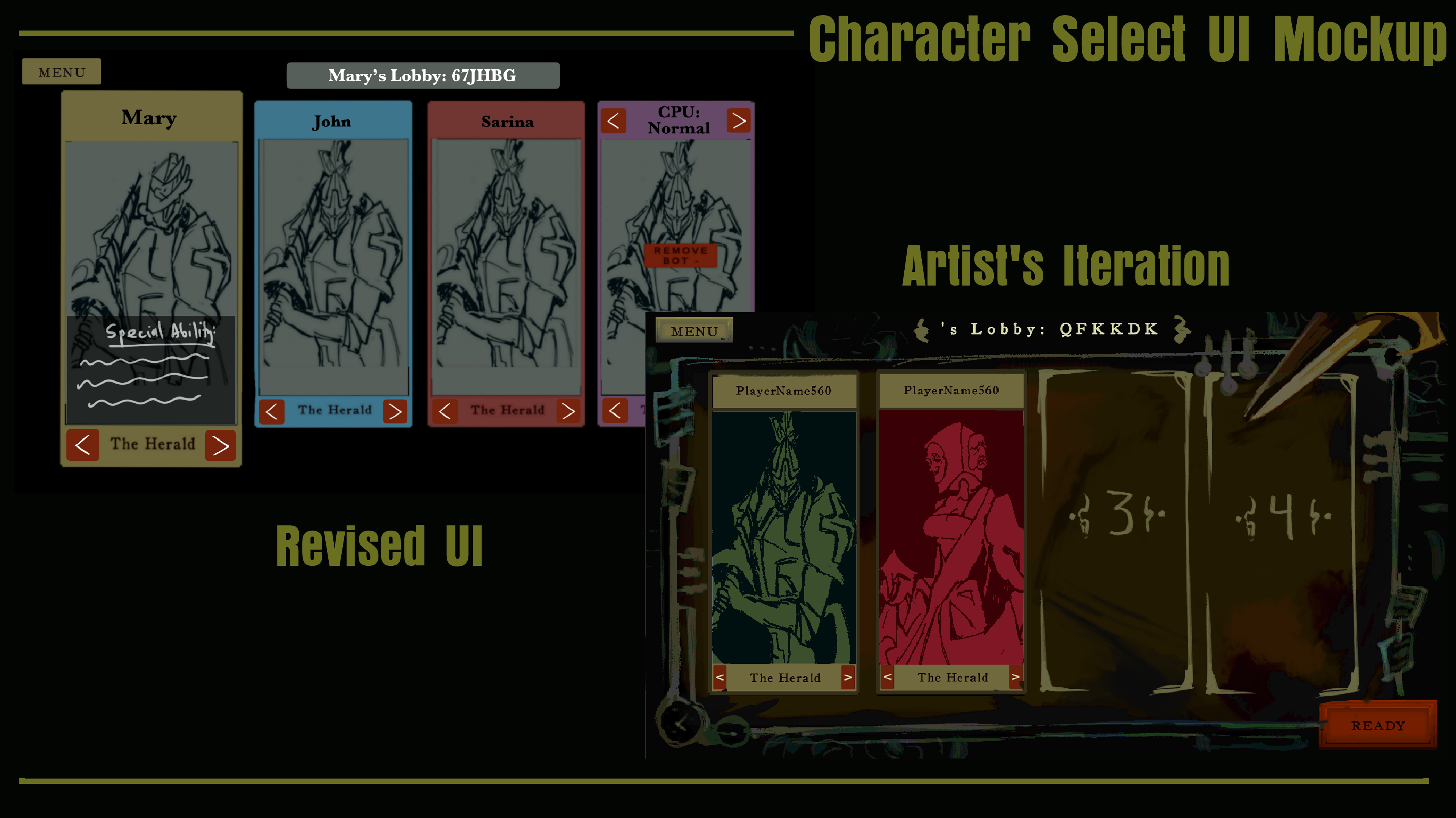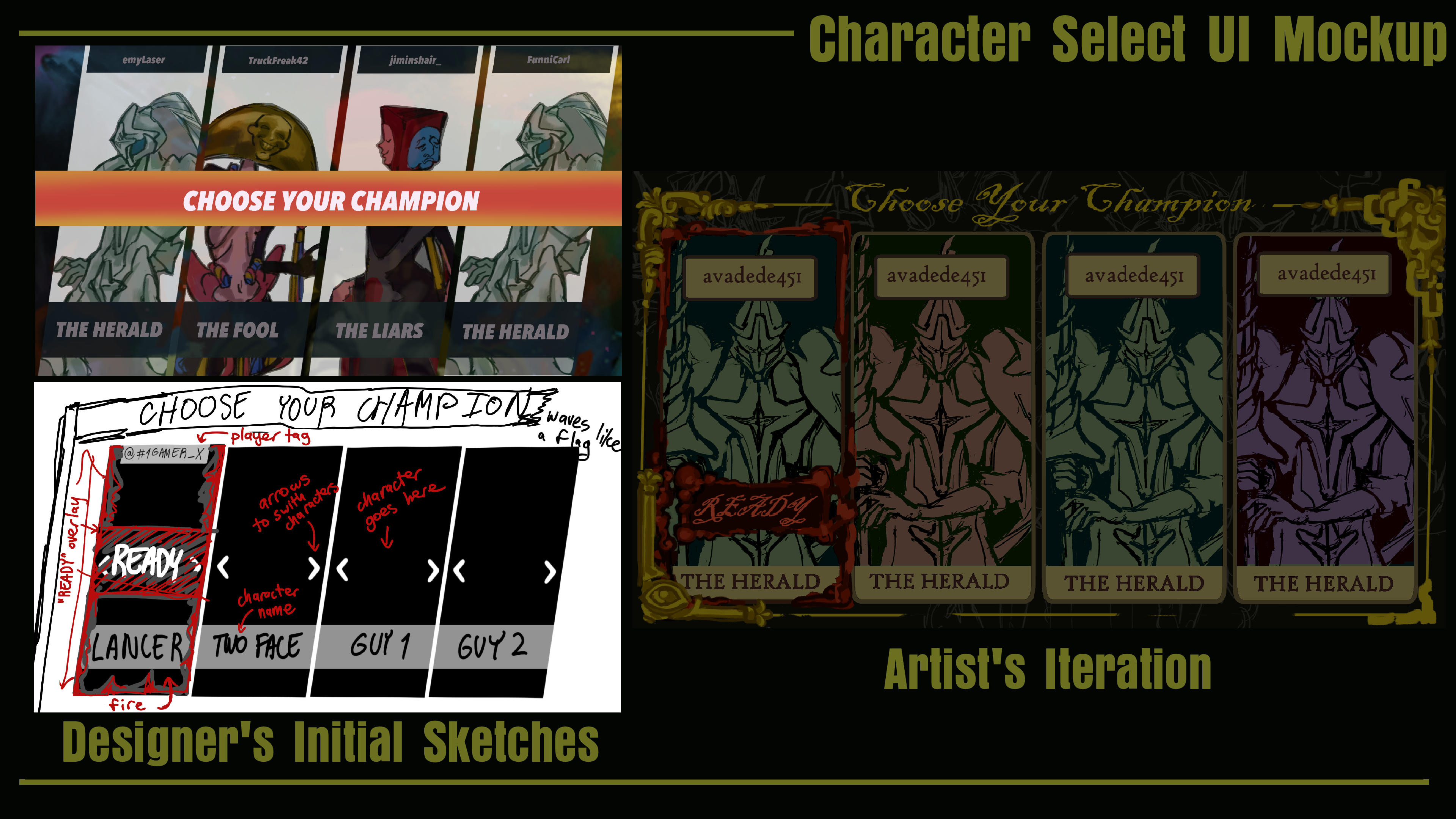 Following my conecept art, the designer revised the character select UI. I then drafted a sketch of the color pallette, background, and decorative elements.