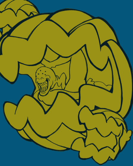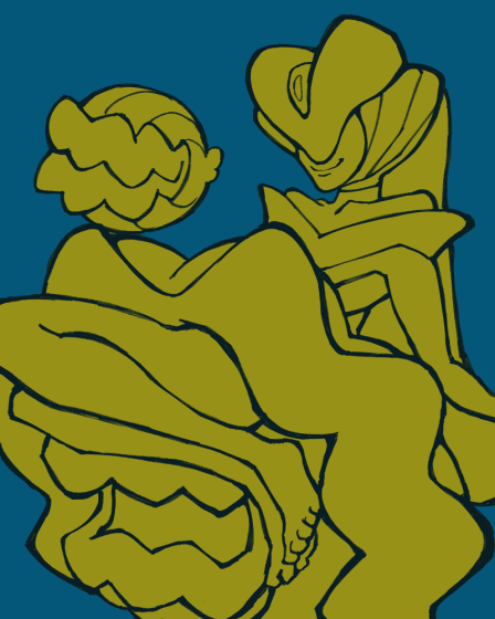 their body, whom she shares with a blue-faced elderly man and a rotted, grey skull.