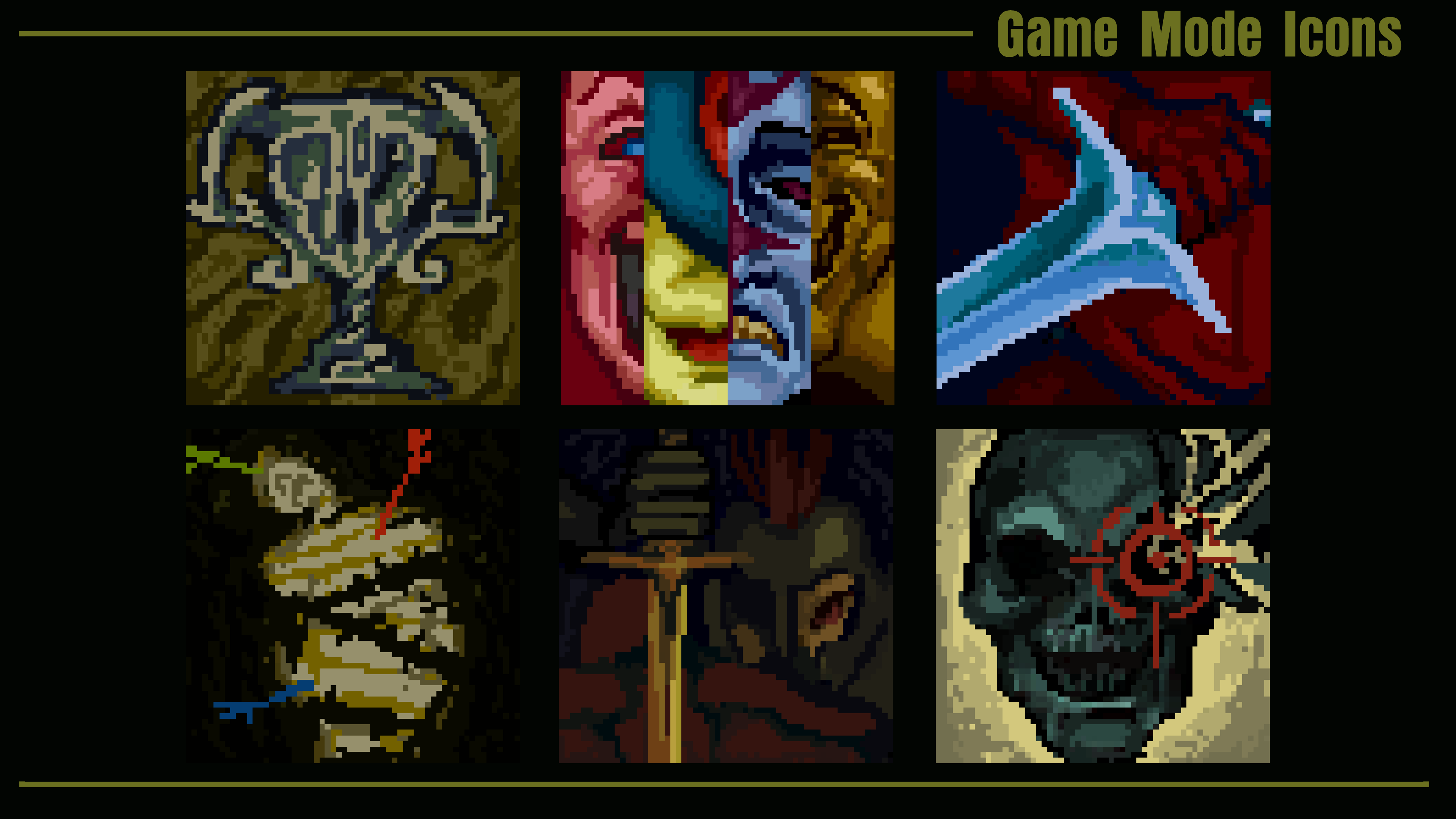 The illustrations corresponding to different selectable game modes, such as the "Training" and "Battle" modes.